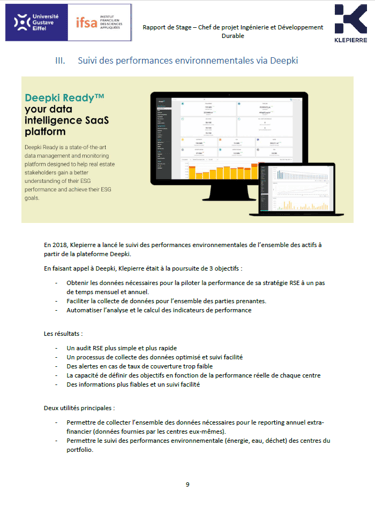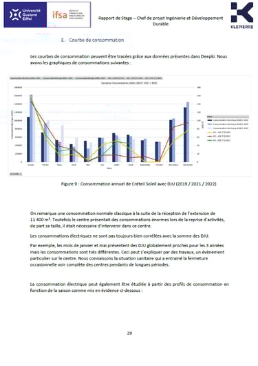 Mon stage de fin d'étude chez Klépierre, dans le cadre du programme, a été une expérience particulièrement exigeante en termes de rendus et de résultats, avec une dimension internationale. Cette expérience a sollicité ma capacité d'adaptation et ma maîtrise des enjeux énergétiques, sociaux et économiques de l'entreprise, renforçant ainsi ma compréhension pratique des défis environnementaux à l'échelle mondiale.